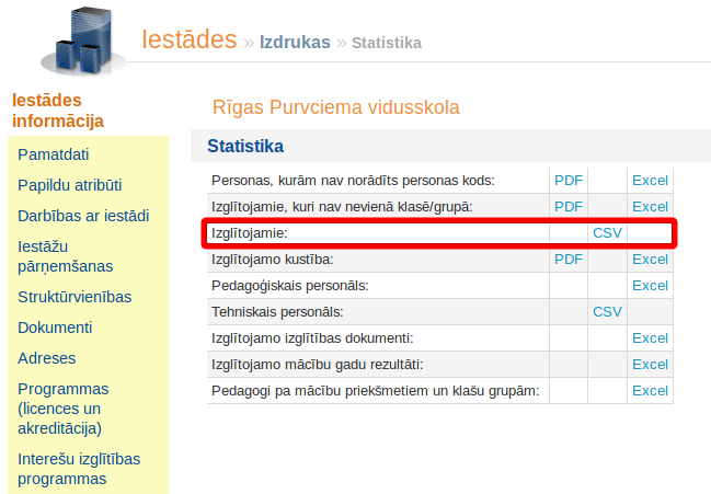 Lai eksportētu datus no VIIS sistēmas, dodieties uz "Meklēt un apskatīt iestādes datus" > "Izdrukas" > "Statistika" > "Izglītojamie" un eksportējiet šo CSV savā datorā.