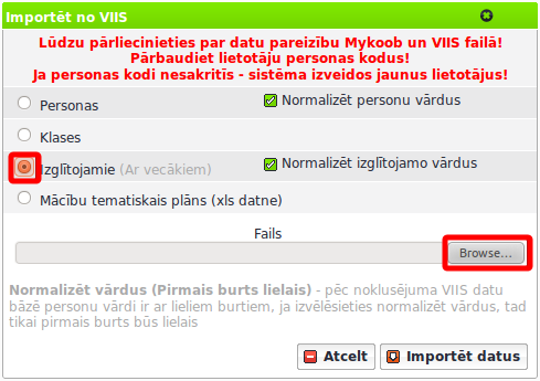 Lai importētu šo CSV failu Mykoob sistēmā, dodieties uz "Dati" > "Izglītojamie" > "Importēt/Eksportēt". Šajā logā spiediet "Importēt no VIIS", ieklikšķiniet "IZGLĪTOJAMIE (AR VECĀKIEM)" un tad norādiet ceļu uz datorā saglabāto CSV failu, kuru eksportējāt no VIIS.