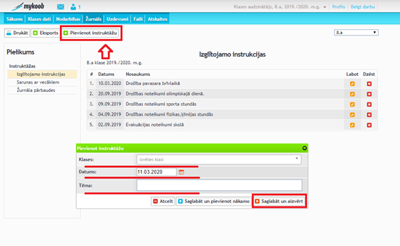 4. Lai pievienotu instruktāžu, spiediet “Pievienot insturktāžu” un ievadiet visu nepieciešamo informāciju (klase, nosaukums un datums). Kad tas ir izdarīts, spiediet “Saglabāt un aizvērt”.